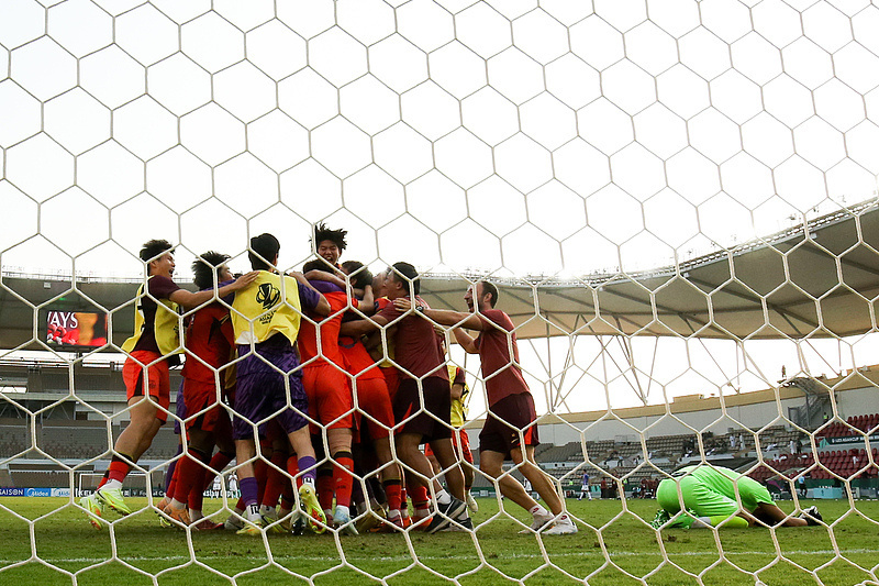 中国队庆祝本队在本届亚洲杯8强赛的点球大战里胜出(图自视觉中国)